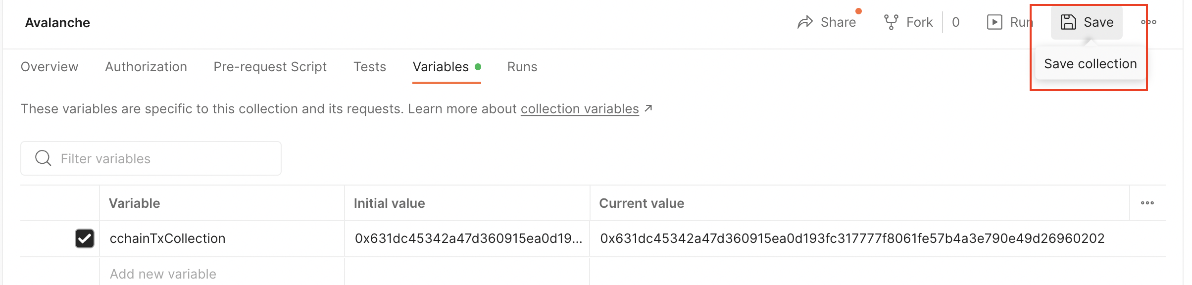 Only default variables are used in the Avalanche Environment file. To learn more about using the secret type of variables, please checkout the Postman documentation.